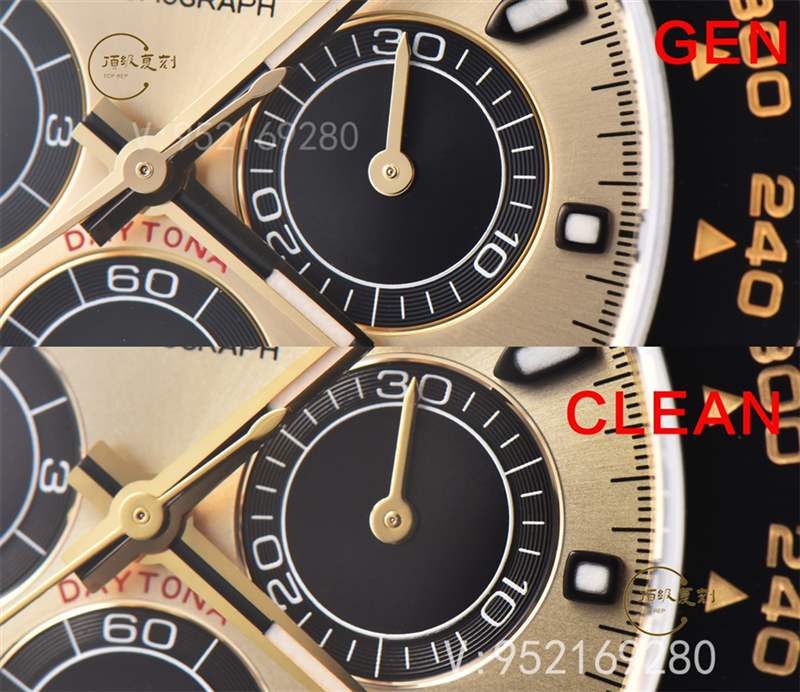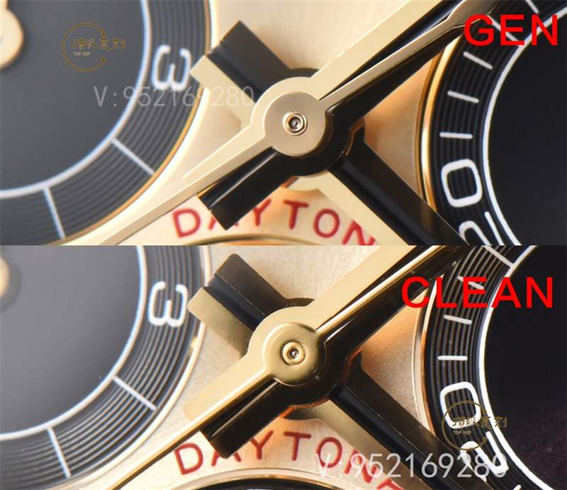 在字面方面來說,此次CLEAN廠進(jìn)行了重新定義,顏色方面也是極致的達(dá)到金色為主,同時對于顏色方面也是進(jìn)行了真空pvd電鍍,并非普通的噴油調(diào)色,pvd好處在于電鍍層可以控制在2-4um微米。不以及計(jì)時小眼圈的中間黑色大陽紋以及邊緣d紋完全按照真品一比一開模,對于整體細(xì)節(jié)方面也是做的很靠譜!手表的表面顏色非常接近于原來的細(xì)節(jié)!