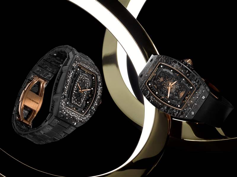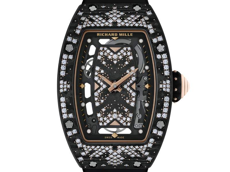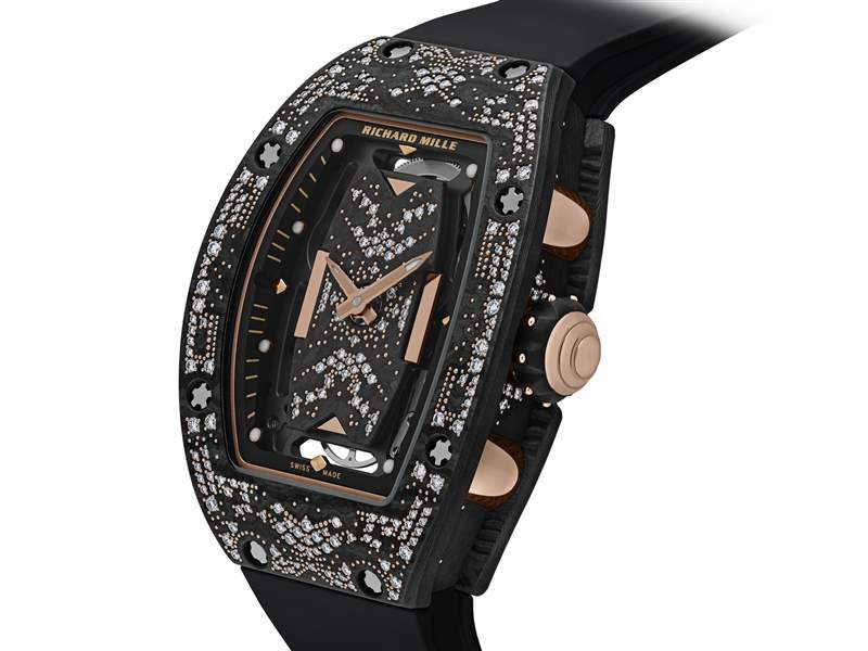 新作在工藝上體現(xiàn)出 RICHARD MILLE 寶石鑲嵌工藝的突破——在極為堅(jiān)硬的 Carbon TPT 碳纖維表殼上密鑲鉆石。由于碳纖維材料的物理特性與金屬不同,制表工匠需要在表殼上鉆孔,然后嵌入玫瑰金鑲爪,最后再鑲?cè)脬@石。碳纖維低調(diào)的啞光黑色更襯托出鉆石的火彩。