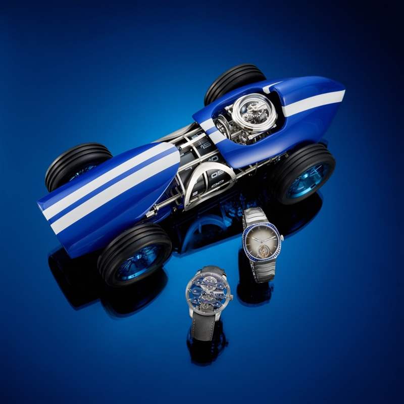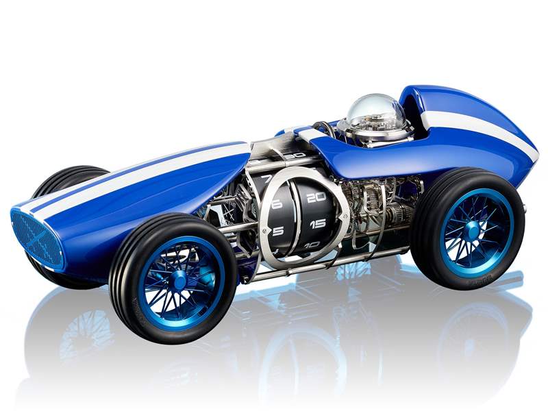 搭載 Caliber 1855 MHD 手動上鏈機芯,提供長達8天的動力儲備。機芯上鏈方式尤為有趣——你只需在桌面上手動拉著小賽車「倒車」就能為發條上鏈,從駕駛艙可以直接看到機芯擒縱結構。限量18件,官價34000美元。