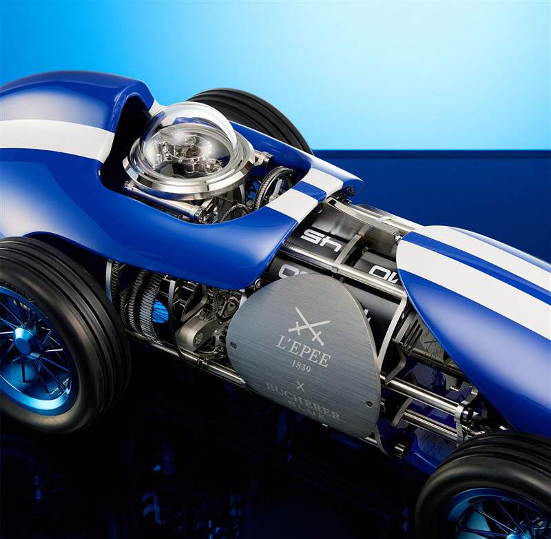這只座鐘的外形如同一輛帥氣的小賽車,流線型的外殼由鋁合金制成,重量約4.7千克。車身和輪轂采用醒目的亮藍色涂裝,車身右側銘牌上刻有 L’Epée 和 Bucherer BLUE 的標志,左側以數字轉盤方式顯示小時與分鐘,轉動賽車方向盤可以調校時間。