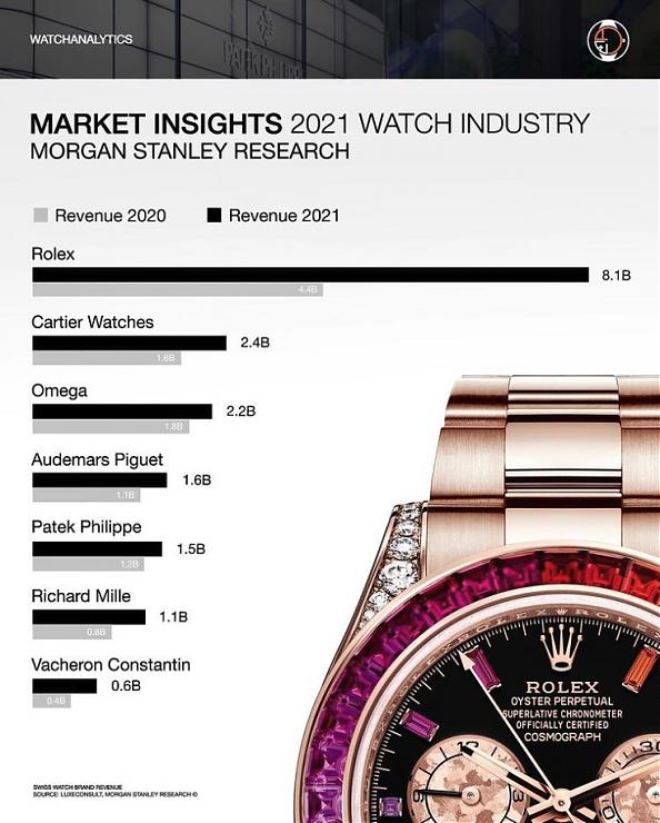 排行第一的ROLEX在2021全年營業(yè)額預(yù)估為80億瑞士法郎,占瑞士手表銷售額約28.8%;其次為CARTIER與OMEGA各為23.9億瑞郎與22億瑞郎。四大家族品牌包括ROLEX、PATEK PHILIPPE、AUDEMARS PIGUET以及RICHARD MILLE,在2021年的營業(yè)額占全市場份額43%;鐘表集團(tuán)包括Richemont、Swatch、LVMH以及Kering共占49%,其余份額為其他品牌。