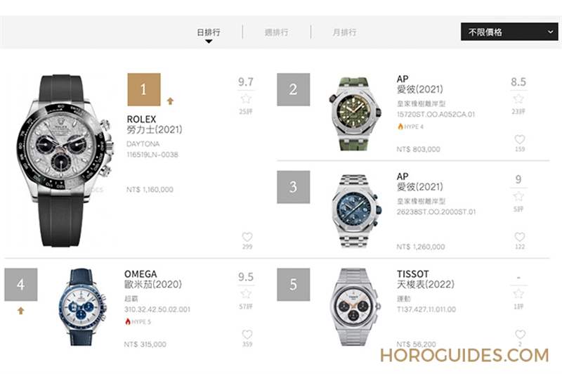 在這個數(shù)據(jù)為王的時代,排行榜或許是最直覺的一種資料類型。在HOROGUIDES提供的站內(nèi)資料當(dāng)中,事實(shí)上也整理了品牌搜尋熱度的TOP 10排行,以最近30天為單位,可以快速看出近期表友們關(guān)注的品牌,點(diǎn)擊后并可連結(jié)到該品牌頁面。另外還有單一表款的TOP 100百大熱搜排行榜,包括當(dāng)日的即時排行、周排行以及月排行;每到年底,更有百大熱搜排行榜的專頁與特別影片,由鐘表平臺總編、鐘表店家、資深藏家等各界達(dá)人點(diǎn)評榜單,已成為表迷必定關(guān)注的年度話題。