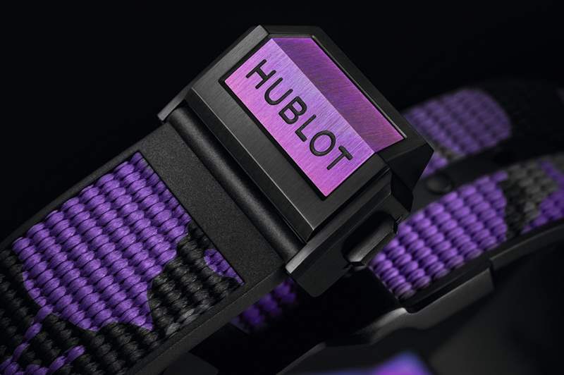 Big Bang DJ Snake腕表于全球限量100枚,提供兩款表帶以供選擇,第一款表帶由橡膠制成,飾以灰色、黑色和紫色迷彩圖案,與表殼反射的斑斕色彩相呼應。另一款表帶同樣采用橡膠材質,帶有黑色棱紋圖案。兩款表帶的表扣同樣呈現了與表殼和表圈相同的「牛頓環」視覺效果。每款均配備品牌專利的「一鍵式」快速更換表帶系統。