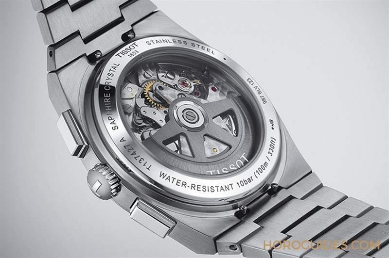 PRX自動計時碼表由Valjoux機芯A05.H31提供動力,也就是ETA 7750的延伸機型7753,向來以價格實惠、以及具有一定水準的精準度與穩定性而聞名,因此是行之有年的知名機種。表面布局為3、6、9計時盤,動力儲存并延長至60小時,自動盤并加碼鏤空與打磨裝飾,視覺更為豐富。