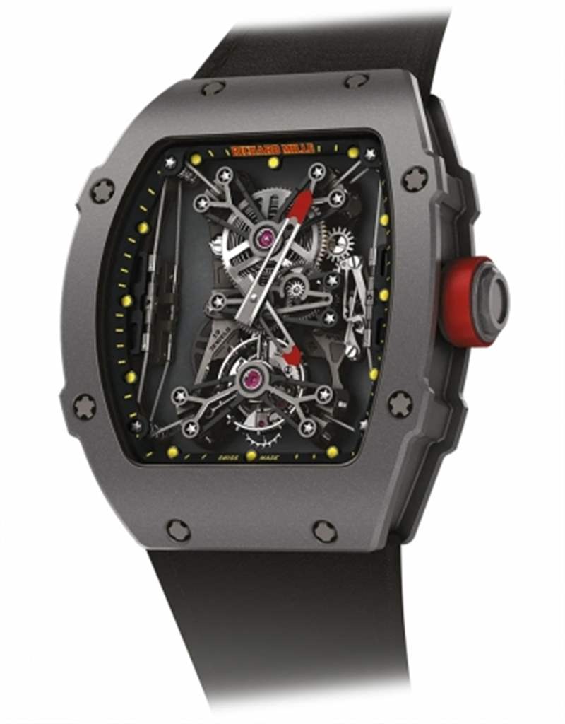 2017年推出RM-27-03 Rafael Nadal Tourbillon,此款表可以承受高達10,000G的沖擊力,表殼采用了紅黃色調的TPT?碳纖維表殼,這樣的配色代表了Nadal的祖國西班牙。機芯采用鏤空?體式TPT?碳纖維底板上,同時精簡了整體結構中的零件,讓腕表更加輕盈;RM27-03機芯的采???拋光漸進式倒角,雅致的鍛造表?,而獨特的上橋板造型,還特別作成像是公牛般的抽象圖案,限量50枚。