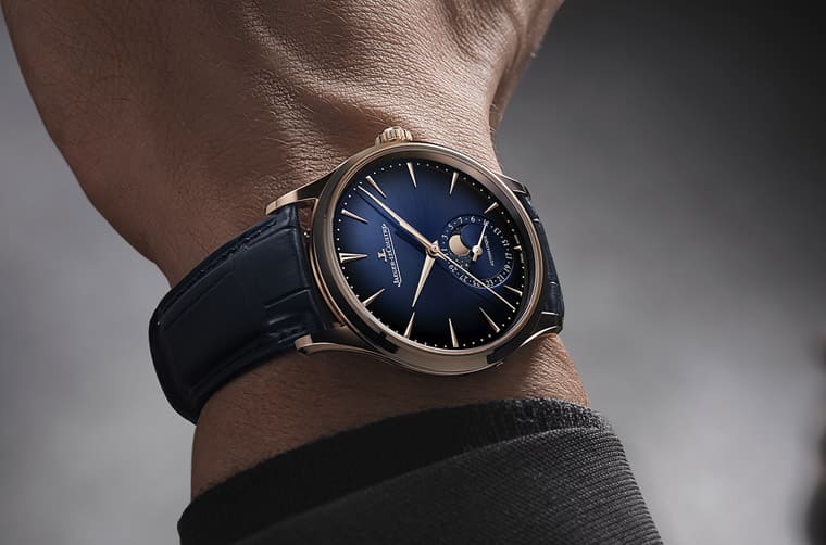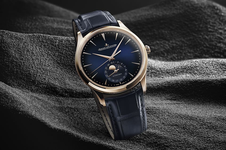 ▲積家Master Ultra Thin Moon 2023年改采玫瑰金表殼,搭配藍色調詮釋紳士品格。