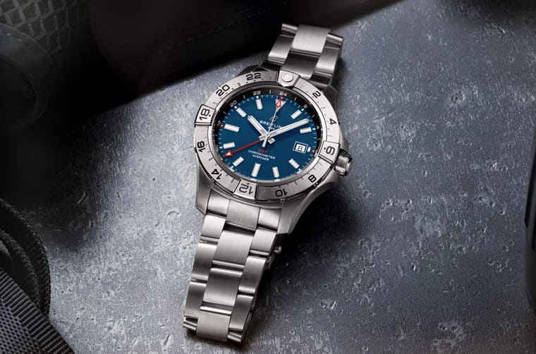 與計時碼表同尺寸的尚有世界時區自動表,表款同樣以不銹鋼制成,外觀線條與計時碼表大同小異,比較明顯的不同即在于沒有計時按把,同時百年靈也因應手表的定位與功能性,將表圈上的刻度從60分鐘改為24小時,另外面盤外緣還有另一圈24小時刻度,搭配GMT指針能衍生出第三地時間功用。這款表分別有黑色或海軍藍兩種面盤配色,其GMT指針以及秒針著針尖都涂上紅色,在深色面盤背景上看起來特別清楚。手表搭載B32機芯,它的功能在現代跨國移動頻繁的情況下格外實用,不過動力儲存42小時不算特別出色,幸好機芯為自動上鏈系統,隨著佩戴者日常活動能持續替機芯補充動能。