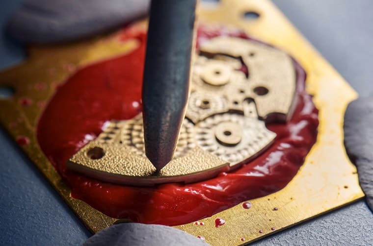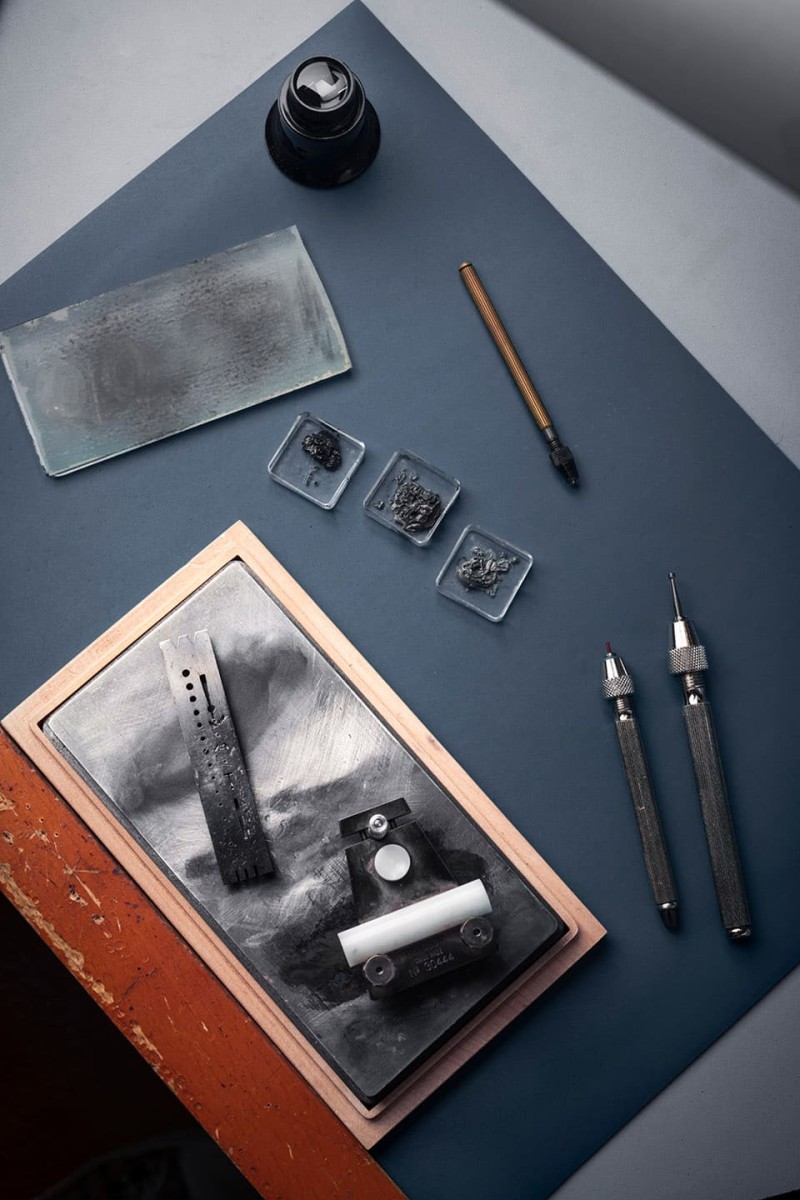 FC-980機芯的零件講究地以手工完成,康斯登旗下有兩位資深制表師專門負責這款機芯的制作與組裝,他們在制作過程中會用用卡布倫銼刀替零件進行倒角處理、用錘子和針進行敲擊形成機芯夾板的不規則紋路,并在機芯底板、陀飛輪框架底部橋板與夾板上使用僅9μm的砂紙,磨制出狀似隕石面盤的交錯紋路。包括固定螺絲外表也以金剛砂進行拋光,細心處理后的螺絲在不同角度受到光線照射下,能呈現從鋼色到黑色的漸變光澤,每一枚FC-980機芯的正反側會有40顆螺絲,每一顆都需要至少40分鐘的修飾才能完工,因此整枚機芯的修飾會需要花上數周時間,制作難度由此可見一斑。
