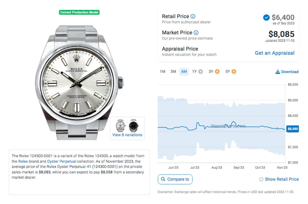 目前41mm的OP手表除了彩色氣泡面以外,其他幾種面盤的行情經過一年半多的撞墻期后都已經有所下調,光是從2023年第1季中后段迄今這半年多的時間來,手表的二級市場價格又有了些變化。其中價格最穩的其實是相對樸素的銀面,根據高級手表市場調查研究機構WatchCharts的資料,這款表的身價雖然是現役五款OP中最低的(8,085美金,約合臺幣25萬9),但它過去半年來的價格曲線還滿平穩的;反而是前兩年聲量高的綠色漆面如今行情已降至9,418美金(約合臺幣30萬2),對照半年前還在1萬美金出頭的行情,等于半年來就縮水了3萬多臺幣。倒是2023年才剛上市,搶手程度還在高點的OP彩色氣泡面,過去一個月行情有再漲高一波,目前成長到17,572美金(約合臺幣56萬4),短短一個月前后身價變化頗大,接近這款手表剛出現在二級市場一度喊到超過1萬7美金的高峰,算是擺脫了之前一段時間的低潮。
