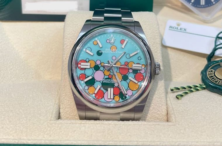 不過OP彩色漆面并非五種尺寸五色都有,僅31、36和41mm有彩色漆面的待遇,而且其中也只有36mm五色齊全,其他兩種尺寸都分別少了一個顏色,加上2022年后勞力士又大舉減少彩色漆面的款式,例如41mm就被砍到只剩下綠色一種顏色,市場的選擇頓時少了許多。2023年品牌再端出「慶典」(Celebration)面盤圖案,也就是表迷口中的「彩色氣泡面」,又再把人們的注意力拉回這個系列上。目前Oyster Perpetual系列男性優先追求的41mm款式定價如下: