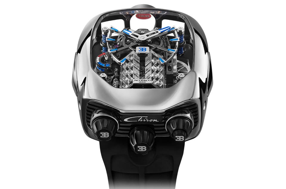 Chiron Tourbillon顧名思義設(shè)計靈感來自布加迪的超跑Chiron,雖然它的功能復(fù)雜度達到陀飛輪等級(還是品牌首見的傾斜30度飛行陀飛輪),但是手表真正讓人驚嘆的部分反而在于立體面盤下半部的仿超跑引擎活塞與曲軸設(shè)計,佩戴者只要按下右側(cè)的按把,這時曲軸會開始旋轉(zhuǎn)、活塞也會開始上下作動,豪邁的視覺效果猶如正在加速沖刺的超跑, 令人看得嘆為觀止。