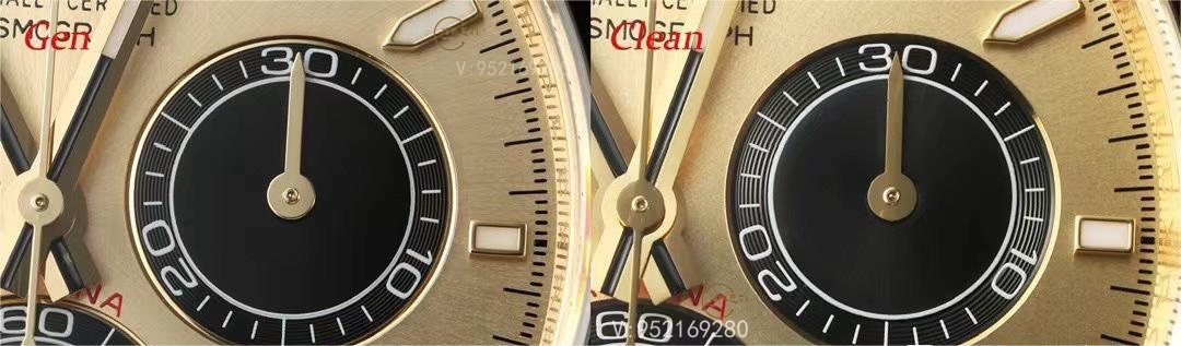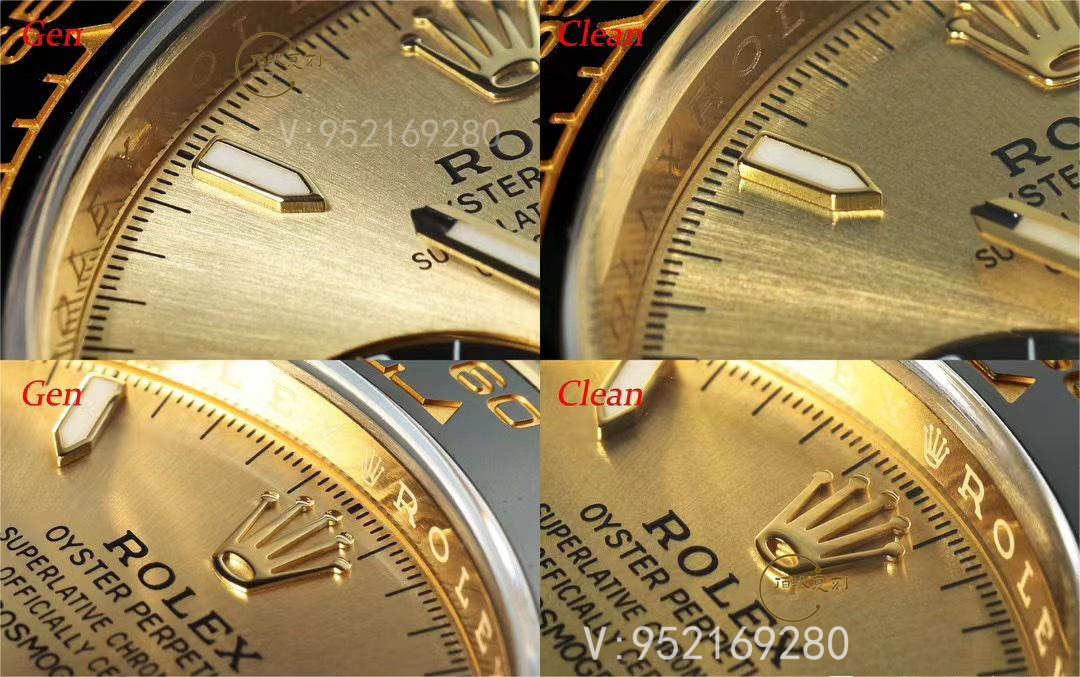 這個4131余文樂已經出了有一段時間了,真假對比最近才整理出來。表盤顏色,太陽紋,字體印刷,都是可圈可點。116518的余文樂已經是無敵的存在,其實126518也是延承一樣的工藝。字釘粗細問題,因為當時同時購買了6只新款4131原裝,水泥灰 余文樂 黑白熊貓 間金*2,我們仔細研究后發現,真品字釘粗細有差別,指針也有差別。對于以上說法存疑的表友可以去翻看之前的126519水泥灰/126500黑白對比圖。c廠每年經手過的真品勞力士也是數不勝數,對于勞力士所有款式的所有細節也是順手拈來。也請相信我們的專業能力。c廠一路走來,磕磕絆絆,感謝所有的表友的支持。我們也將以最好的產品質量來回饋表友的信任。c廠相對其他工廠價格略高,那是因為,在購買真品這件事上有一種執念,無真品,不起模的原則。勞力士原廠套娃,換換盤色就是新款,c廠為了跟足原裝,同系列產品 ,不同顏色都要每個都買回來對色。c廠對于配件品質要求都是極其的高,甚至仿c的工廠找到c的某些配件代工廠,去單獨購買c廠篩選下來的瑕疵品。實在是不理解這樣的操作。