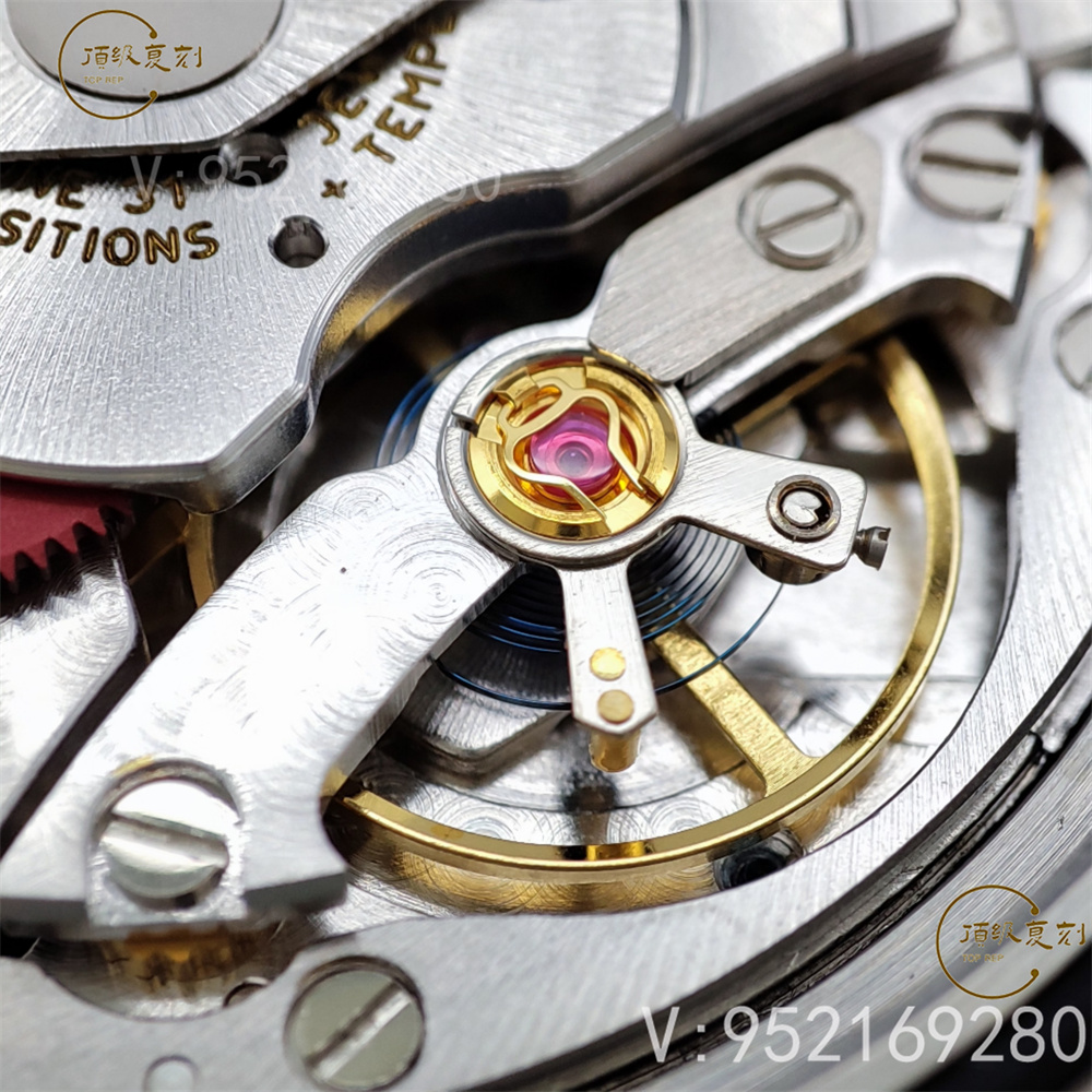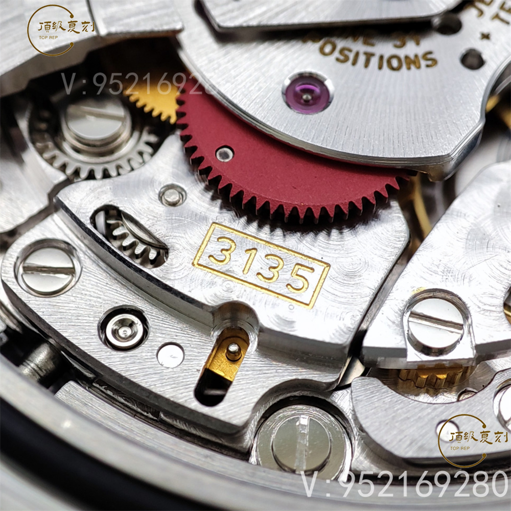 再來(lái)看一下機(jī)芯,搭載的是丹東的3135機(jī)芯,整體來(lái)看一下它的打磨,整體的打磨還是做的不錯(cuò)的。然后它這個(gè)快慢裝是向上,金色的本輪整體都沒(méi)什么問(wèn)題,這枚機(jī)芯的穩(wěn)定性一直都非常好,因?yàn)橐彩怯昧撕脦啄甑臋C(jī)芯了,反饋的都很不錯(cuò),返修率也比較低,基本沒(méi)什么返修率,整體的結(jié)構(gòu)包括功能,然后動(dòng)儲(chǔ)都是和某個(gè)原裝完全一致的,所以機(jī)芯方面是非常對(duì)版的,后蓋雖然是密底的表,它這個(gè)后蓋750的標(biāo)識(shí),然后貴金屬的標(biāo)識(shí)都是有的,整體后蓋的這個(gè)細(xì)節(jié)都非常不錯(cuò),密底的表,雖然看不到里面的話它,但是它這些細(xì)節(jié)做的都非常到位。它這個(gè)后蓋的這個(gè)750,然后鋼印狗頭,鋼印logo標(biāo)都是都是有做的,它這個(gè)小細(xì)節(jié)完全就是對(duì)版原裝的。整體做工非常頂級(jí)的一款腕表。