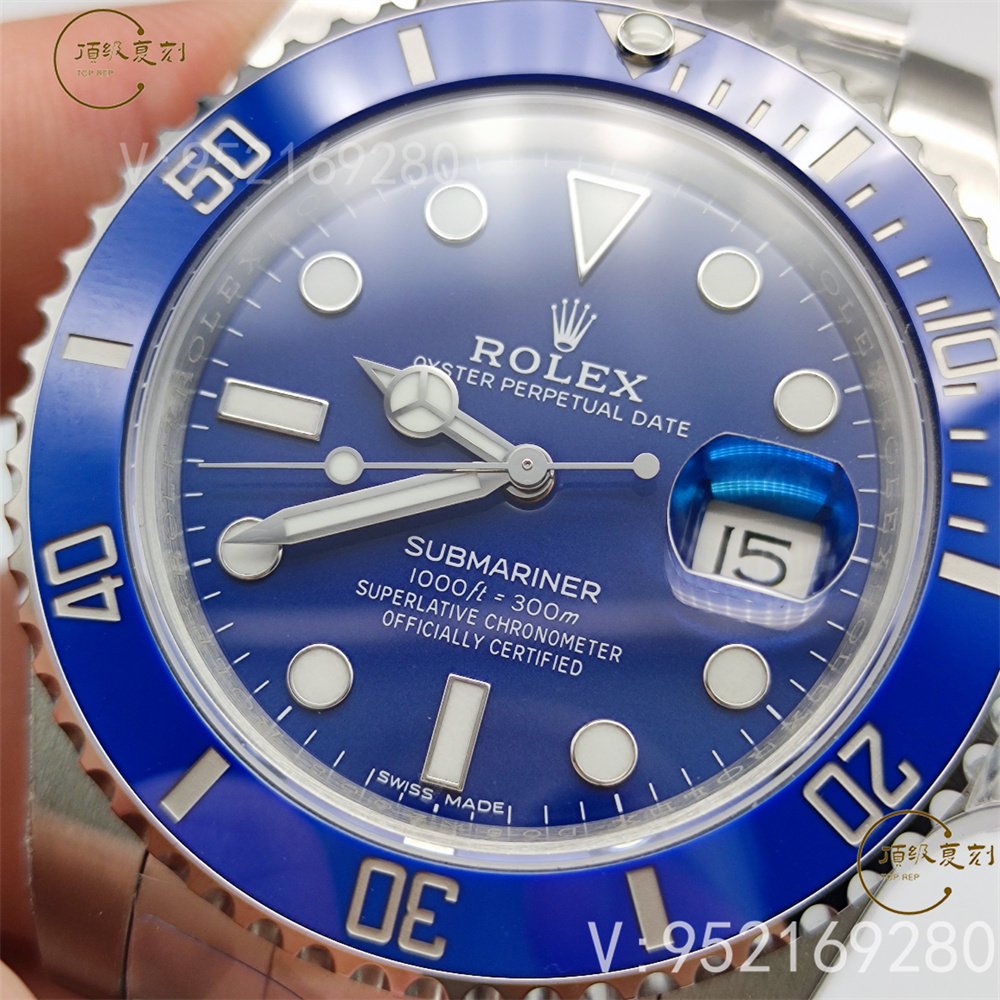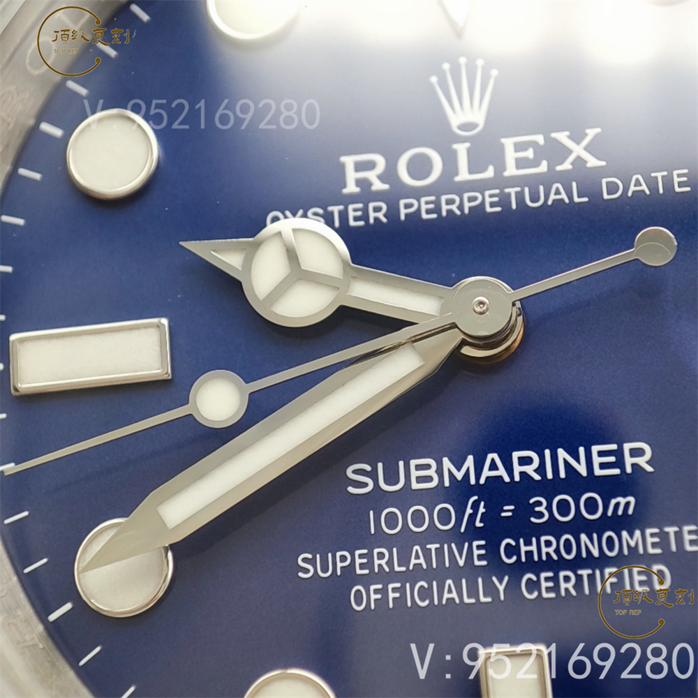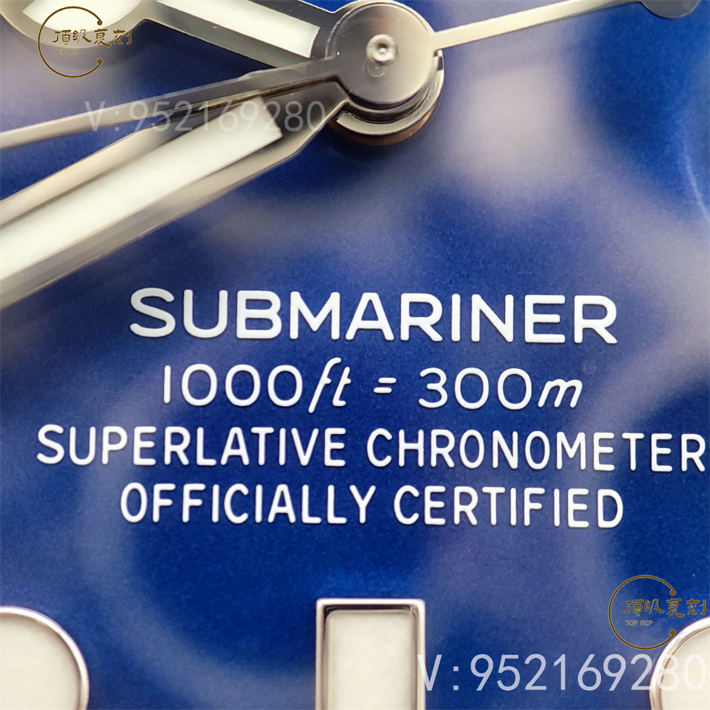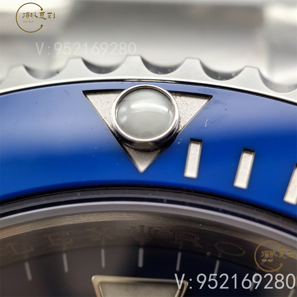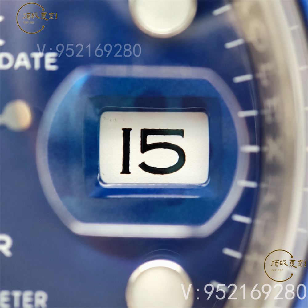 直徑是40mm,厚度是12.7,表殼和表鏈都是采用的904的精鋼材質(zhì),表殼兩側(cè)是做了一個(gè)拋光的處理,然后看一下把頭的logo做的也非常工整,比較立體,然后三個(gè)小點(diǎn),中間大,兩邊小,這個(gè)都是和某個(gè)原裝完圈一致的。表殼是中間拋光,兩邊拉絲,看一下拉絲做的也是比較細(xì)膩,包括表耳的部分也都是做了一個(gè)拉絲的工藝。看一下扣子的logo,這個(gè)logo也是一體成型的,拉近看也看不到焊接點(diǎn),然后內(nèi)面是做一個(gè)磨砂的處理。扣子的logo,龍頭標(biāo),包括750,然后這些貴金屬的標(biāo)志都是有的,因?yàn)樗{(lán)水鬼它是一個(gè)貴金屬的表,這些地方都是都是有的,整體都沒(méi)什么問(wèn)題。