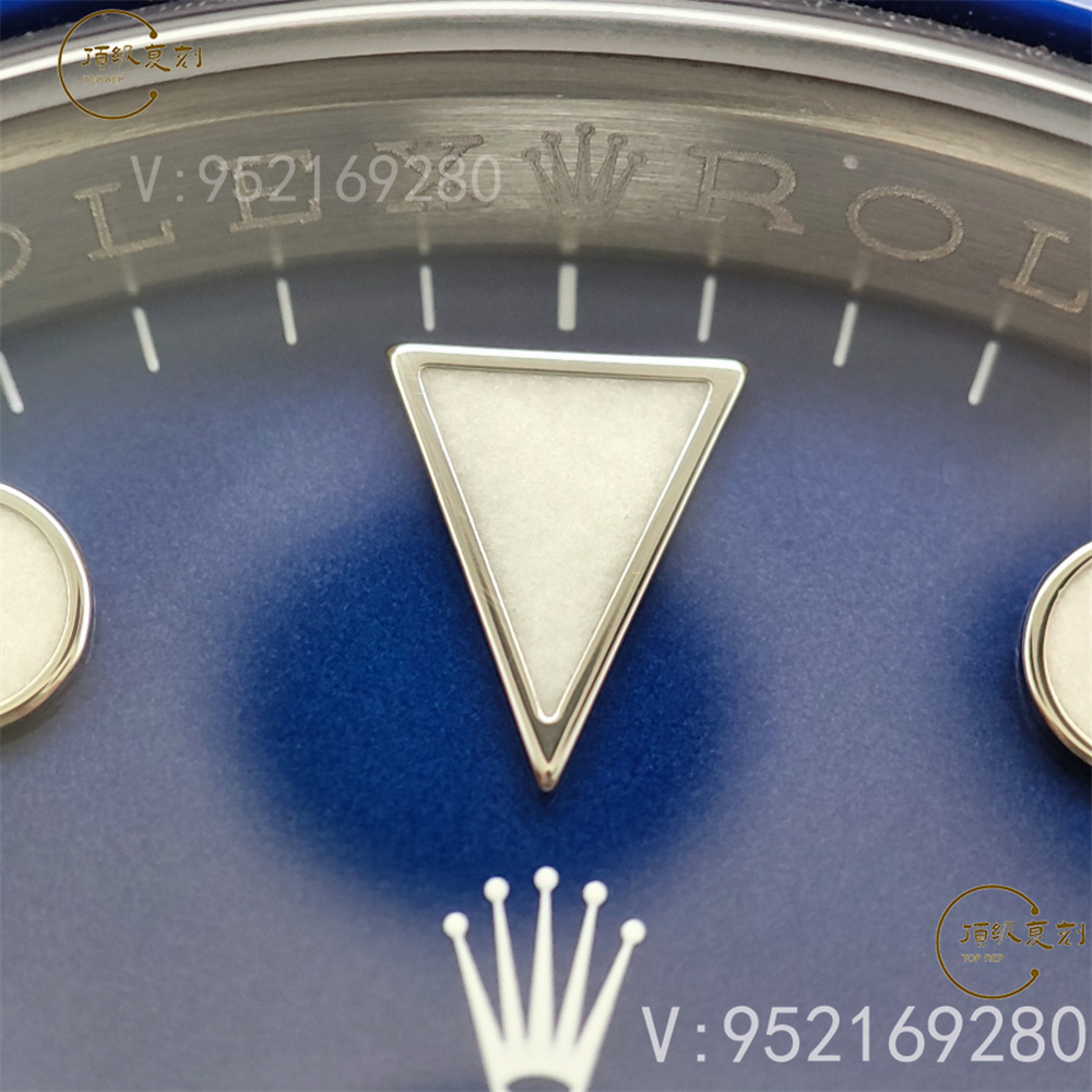 一個(gè)單向旋轉(zhuǎn)的陶瓷圈口,圈口的刻字都是采用的鉑金粉的填充工藝,看一下這個(gè)整體的刻字幫你看一下。做的都非常好,轉(zhuǎn)動(dòng)的手感質(zhì)感也非常好,聲音也是比較清脆的那種感覺(jué),看起來(lái)夜明珠的這個(gè)顏色有這個(gè)微微泛黃的一個(gè)顏色,不是那種慘白的顏色,這個(gè)也是做的比較好的。然后再來(lái)看一下這個(gè)盤面的這種細(xì)節(jié),先來(lái)看一下刻度。這個(gè)六、九、十二的這個(gè)刻度都是有做的圓角的打磨。去眼角打磨的屁部都是有的。這里也都是有做了圓角打磨,這些都沒(méi)什么問(wèn)題,拉近看一下指針,指針這個(gè)指這個(gè)拋光做的也是比較好,沒(méi)有任何的毛刺。實(shí)心的中軸小帽子設(shè)計(jì),這些都沒(méi)什么問(wèn)題,小心結(jié)束也比較到位。