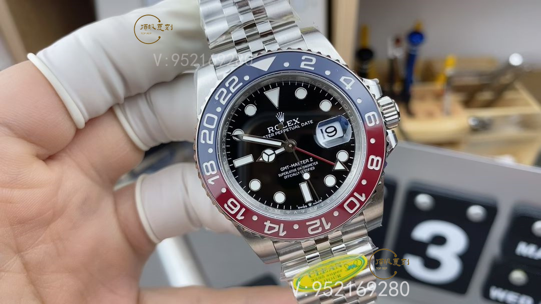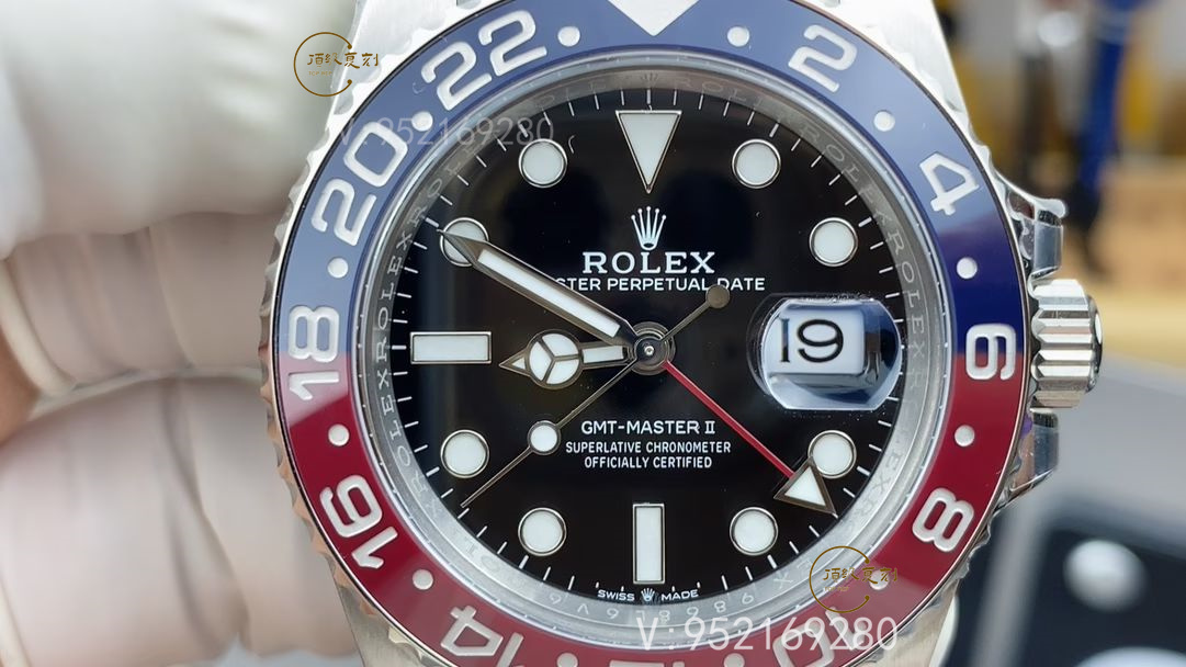 C廠V3版本最突出的就是圈口上的升級,紫光燈照射的藍色部分,圈口會變得更加透亮,做的是非常非常的好,我們看一下這個紅藍連接的部分,這個顏色做的也是非常好的,V3的圈口是對的,當然升級圈口的也不止C廠一家,還有C+廠也是用的這個一模一樣的圈口,不過C+廠用的是上海的3285機芯,它的動儲只有40個小時,沒有C廠的丹東機芯動儲那么高。