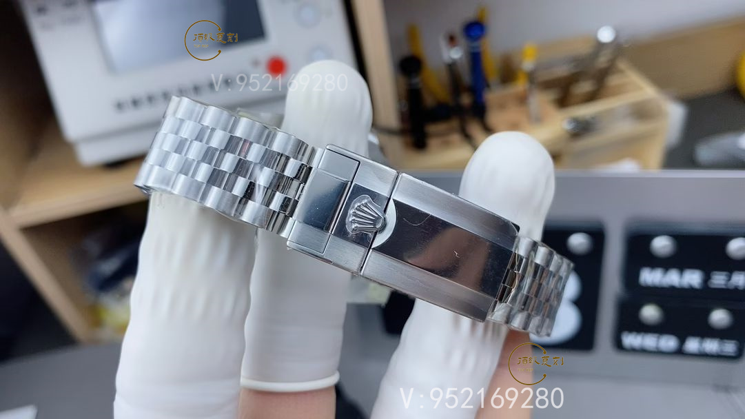 直徑是40mm。厚度是12.4,表殼和表鏈采用的是904的精鋼材質,表殼兩側做了一個拋光的處理,再來看一下把頭的logo做工也沒什么問題,五銖鏈是兩邊拉絲,中間拋光,也有三珠鏈的版本供大家選擇。我來看一下扣子logo也是一體成型的,沒有任何的焊接點,內側是做了一個磨砂的處理,編碼是S6U,不過C廠的編碼是經常換的,所以是不是C廠貨一定不要去看這種編碼,包括貼紙一定要去看是不是丹東的機芯,包括動能不能滿動能狀態下能不能達到70小時。