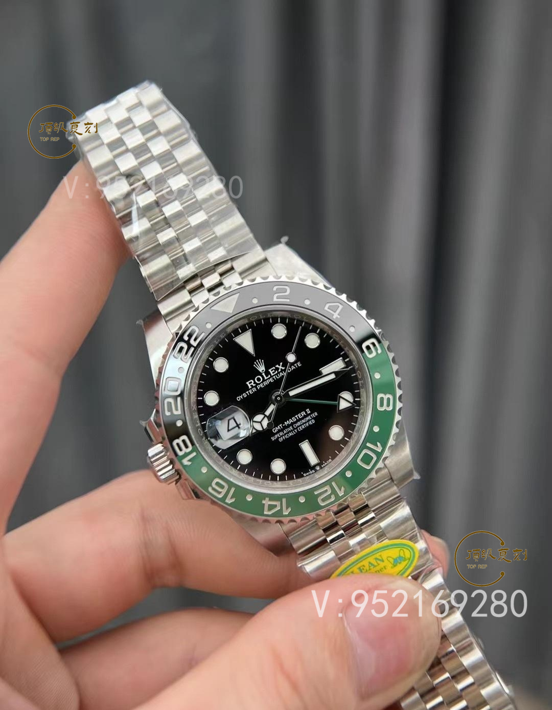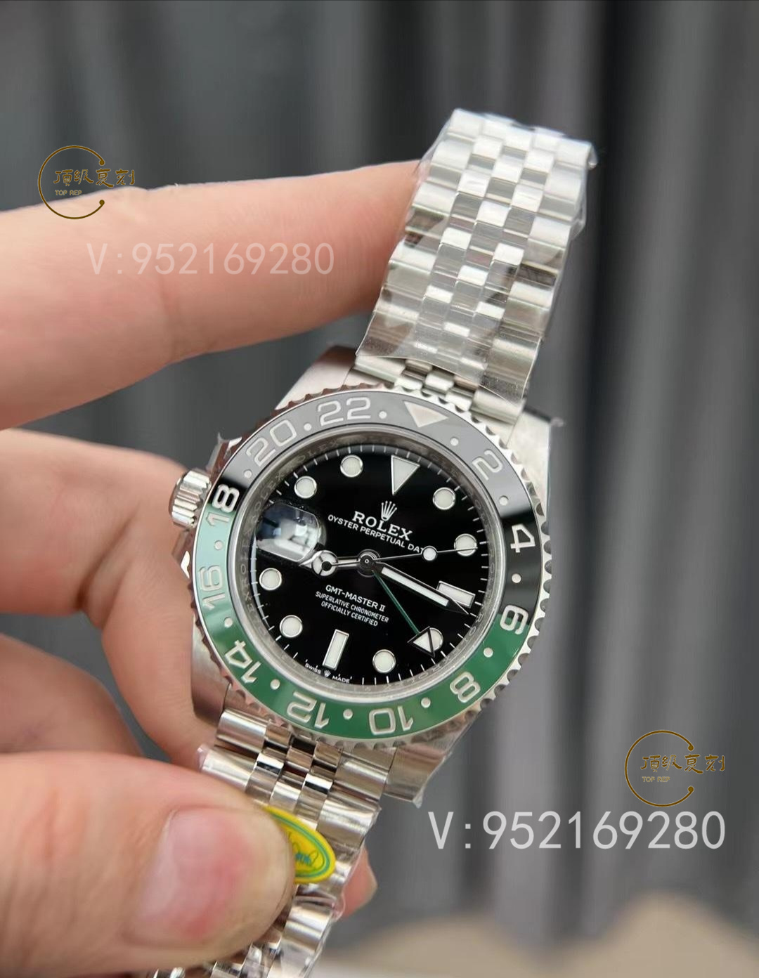 大家好,今天給大家評測的手表是C廠勞力士格林尼治左撇子雪碧圈,這款腕表一共有兩種表帶,一個五珠鏈,還有三株表帶。這款手表比較獨特因為它的把頭在正常手表相反方向,所以目前唯一一個用顏色來打的都在左邊、 只有這個雪碧一圈而已,黑綠雙色陶瓷圈的配色很有特點。復刻表市場上有很多廠在做,然后做的比較好的是C廠,因為C廠用的機芯的是丹東3285機芯,它的機芯是非常穩定的,包括調時間的方式,都是同步的,也是目前行業的最高版本,下面我們來看看C廠勞力士雪碧圈的測評。