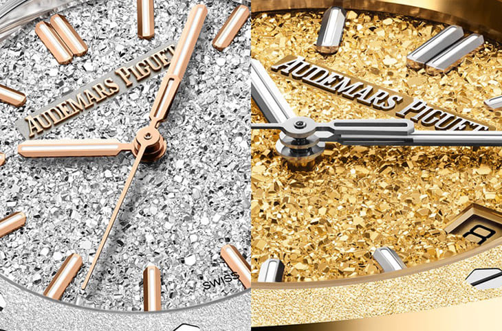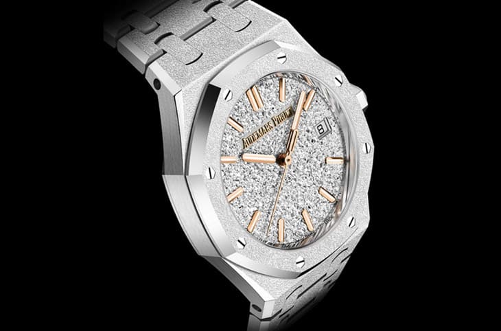 新款皇家橡樹霜金自動(dòng)表提供黃金與白金兩種款式,尺寸為34mm,適合不同佩戴者的喜好。表殼與表帶均采用霜金工藝修飾,展現(xiàn)出與眾不同的奢華感。