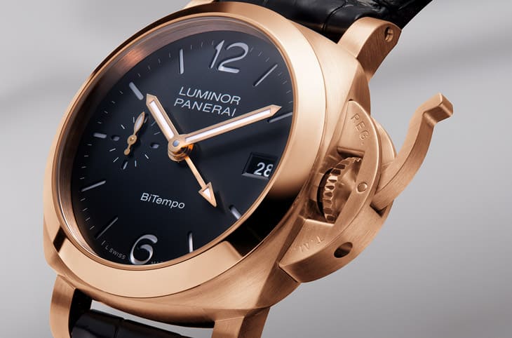 PANERAI沛納海Luminor系列的Quaranta BiTempo兩地時(shí)間款式難得出現(xiàn)貴金屬版本,品牌新發(fā)表的Luminor Quaranta? BiTempo Goldtech? PAM01641采用沛納海獨(dú)家紅金制作表殼,相較同系列、同功能作品先前往往以不銹鋼表殼為主的設(shè)計(jì)蛻變出更為高貴雅致的氣質(zhì)。