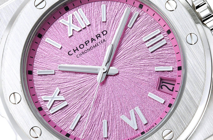 這次新登場的Alpine Eagle三針表無論尺寸大小,一律換上同樣源自阿爾卑斯山的「巖石茉莉」粉紅色調,這種當地盛開的花朵生長在堅硬的巖縫中,展現出不屈不撓的毅力和無畏的精神,因此蕭邦選擇運用此少見又大膽的配色妝點手表面盤,剛好粉紅色系在近兩年有愈來愈多的趨勢,第一眼就很搶眼之余,也逐漸打破過去粉紅色專屬女性的刻板印象。