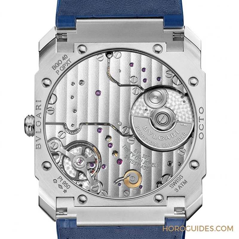 這款集超薄與萬年歷兩大復雜功能于一體的腕表,表盤配置別具特色,最特別的是還同時具備兩種逆跳功能顯示-包含位在12點鐘的逆跳日期顯示與6點鐘位置的逆跳閏年顯示。此表款所搭載的BVLGARI自制BVL305自動上鏈機械機芯,厚度僅2.75mm,整個機芯由408枚零件組成,搭載微型自動盤。在不縮小零件尺寸的前提下,為了創造出薄還要再更薄的最大可能性,必須打破制表既有思維,采用全新方式將所有零件與零件之間的空間盡可能縮減,濃縮再濃縮,整合再整合,好比藍寶石表背被整合到表殼中,在依序將機芯由正面放入表殼、放置上表盤、指針、藍寶石表鏡后,再用表圈封蓋整個表殼。包含連表盤上的時標指示都是為了縮減厚度而經過悉心琢磨的細節,纖薄的時標猶如貼花般地分布在厚度僅0.3mm的表盤上。