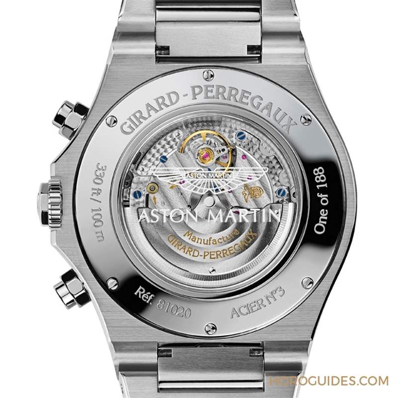 翻到表背,可以發現桂冠系列計時腕表第一次采用透明底蓋。透過藍寶石水晶底蓋,可以欣賞到此表款所搭載的GP03300-0141型自制自動上鏈機芯。這枚機芯的設計是以GP03300機芯為基礎,飾有圓環形、直線形日內瓦波紋與珍珠紋;而機芯上所標示的老鷹圖案,則提點出這枚機芯是由GP自主打造。