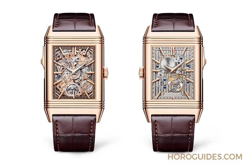 具備強烈視覺張力的正面鏤空面盤與Reverso翻轉系列經典方形表殼產生鮮明對比,而相對低調的背面表盤則強調腕表筆直的線條,主機板亦是表盤的一部分,整個表面均點綴垂直日內瓦波浪飾紋,藍鋼螺絲以及金色指針和時標成為冷銀色調金屬表盤上的精致點綴,在表殼溫暖的玫瑰金色調襯托下更顯精巧。