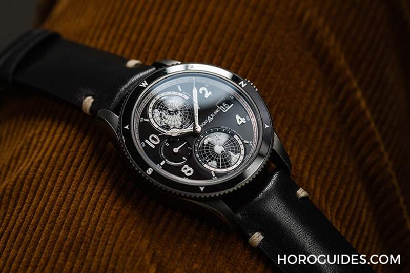 在墨色般漆黑的盤面,分據(jù)上下兩端的南北半球地球儀再顯眼不過,白色的Super-LumiNova?夜光涂層涂布在陸地區(qū)域,地球儀外圈是24小時制的日夜顯示環(huán),因此可以對照出世界時間,當時間流逝,這對地球儀就會隨之轉(zhuǎn)動;受限于盤面空間,轉(zhuǎn)動的幅度訴求精確,真正是感受時間緩慢而確實的流逝。