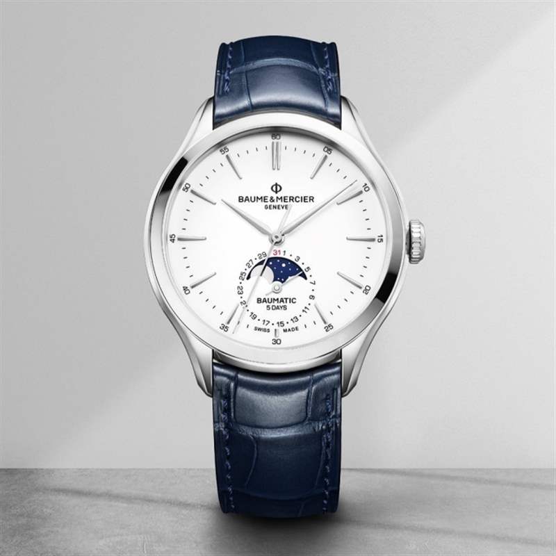Clifton Baumatic系列當然不只有簡單的三針型號,這枚Clifton Baumatic Day-Date Moon-Phase更加入多項實用功能,包括日期、星期、月相,還有系列常備的長動能5 日鏈,一下子升級為一枚small complication,吸引力進一步上升。