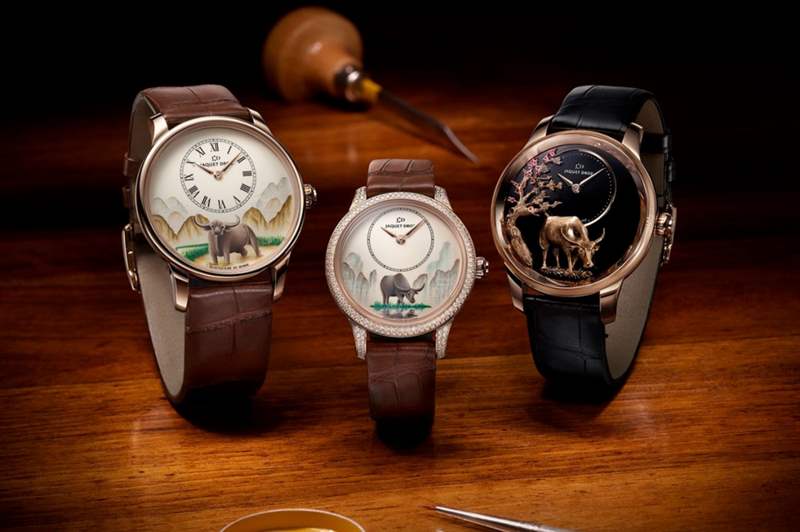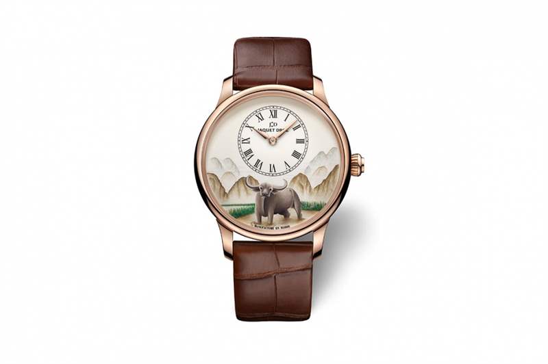 Jaquet Droz亦是生肖表的常客,而且通常都會一口氣推出幾款不同風格。而我個人就最喜歡它微繪的系列。這枚Petite Heure Minute Buffalo先用象牙白的琺瑯表盤上,以微繪工藝畫出霧氣繚繞的群山峻嶺,前面站著一頭英姿煥發、神態祥和的牛。手繪出的這一片柔和寧靜的田園景致別具詩意,極具中國風韻味,全球只限量八枚。
