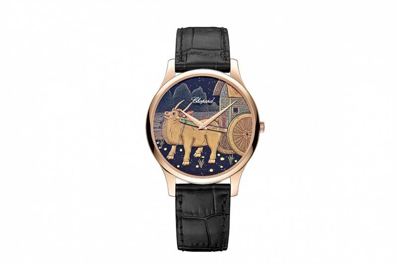 自2013年起,Chopard每年都會以日本傳統蒔繪工藝制作生肖表,透過藝術與時計的結合,向大家拜年。來到牛年,Chopard推出LUC XP牛年蒔繪腕表,遵循蒔繪工藝的特點,在采用產自日本漆樹(Toxicodendron vernicifluum)的生漆原料制作,再于漆層之間灑入金箔,打造出一頭正在拉車的金色公牛,牛毛金光璀璨。金牛以黃金制作,背景飾以珍珠貝母和彩色漆繪,貴氣非凡,象征這個「金牛年」將會大豐收!