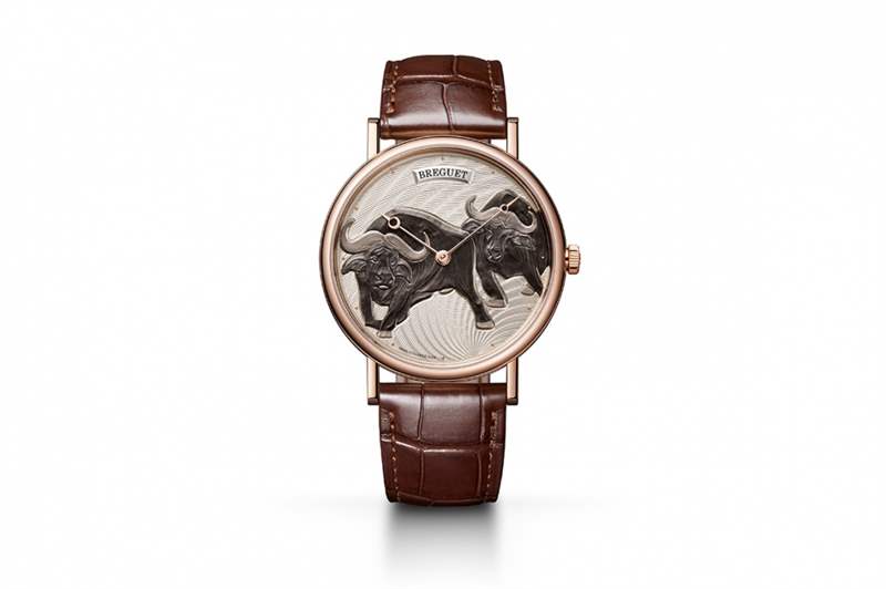 還有寶璣呢,這枚Classique 7145牛年腕表,結合了機刻雕花(Guilloché)和鐫刻技法,兩頭牛深淺不一的黑色色調,是在金質表面經過多次電鍍處理后,讓牛蹄、牛角、牛身、牛眼呈現四種深淺不同色調,活潑生動,立體感極重!而背景的機刻雕花紋路更如波浪般席卷而來,也象征表面的兩頭金牛無論環境如何,都會勇猛前行,非常吉利!