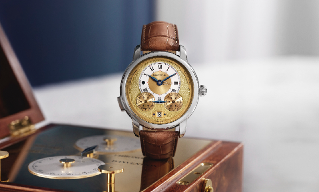 法國制表師Nicolas Rieussec在1821年發明滴墨式計時碼表,在高級制表歷史寫下重要的一頁,MONTBLANC萬寶龍為紀念這項發明問世200周年,推出萬寶龍明星傳承系列Nicolas Rieussec計時腕表限量款200,其設計靈感得自原創裝置的構造,以兩個獨特旋轉式水平對齊計時盤搭配固定雙向時標,并結合麥穗扭索飾紋金色表盤。