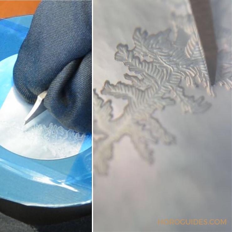 表盤的制作過程,從雕琢纖薄的珍珠母貝著手。先是選用兩片厚度僅0.2mm的珍珠母貝片作為表盤的主體,在這種厚度下的珍珠母貝近乎透明,卻能透出溫潤如玉的漸變色澤;在圖案設計上,制表師將視覺看到的立體場景,由遠而近分割為四個截然不同的圖案,之后采用剪影浮雕技法一筆一畫分別雕刻在兩片珍珠母貝片的正、反面。