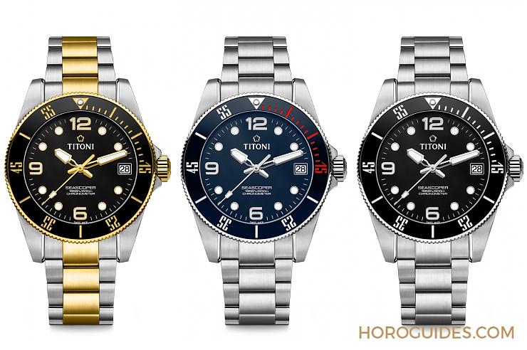全新亮相的Titoni海洋探索600米,外型截然不同于前一代,單向旋轉(zhuǎn)表圈從鋁圈升級為高精密陶瓷圈,色澤飽和,刻度分明,帶來了更為鮮明閃耀的視覺效果;表圈加寬,整體風(fēng)格更顯朝氣。三種不同款式同步推出,包含:黃金海岸(雙色金配色)、潛水藍(藍面/藍色陶瓷圈)、馬里亞納黑(黑面/黑色陶瓷圈),集結(jié)了典型的潛水表元素,手感扎實有份量,表徑42mm的尺寸在展現(xiàn)豪邁與上手舒適性間取得了理想平衡,造型較前一代更形開闊大器。