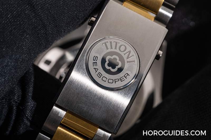 為方便腕表在平日與穿著潛水衣時都能配戴,不少潛水表都會采用快調(diào)帶扣裝置,以便徒手就能調(diào)節(jié)鏈帶長短。Titoni海洋探索600米當然也少不了這項潛水表的基本配備,但向來著重實用又好用的Titoni,所做到的不只是求有,而且是做到更好—表帶帶扣上的Titoni梅花標志,暗藏玄機,一壓就能直接調(diào)節(jié)鏈節(jié),瞬間伸縮鏈帶長度。這個便利性極佳的設(shè)計,使用起來很直覺,操作手感無比順暢,十分爽俐。