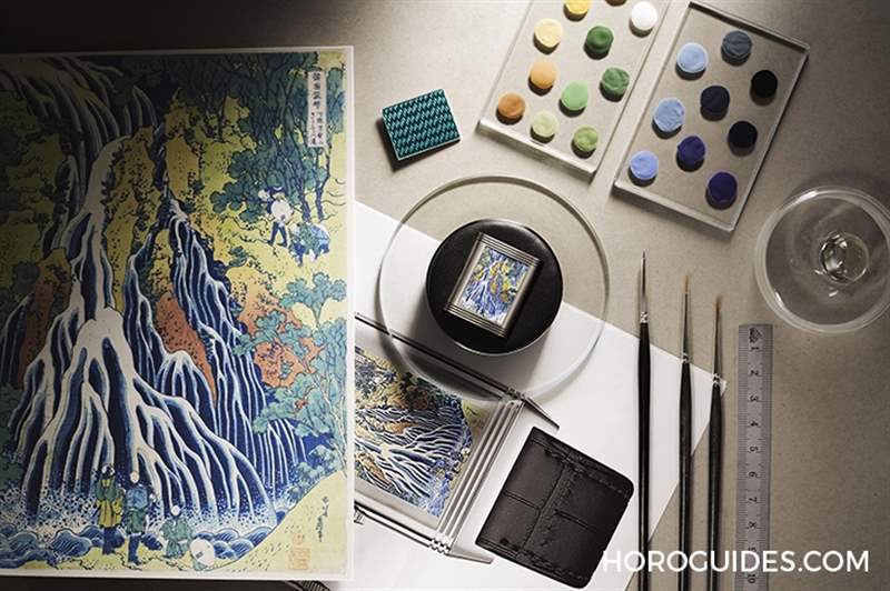 制作過程中第一項挑戰(zhàn)是要將37×24.5cm的原版畫作復(fù)制于約為原作十分之一大小的表面上,同時確保以完美比例呈現(xiàn)每一項細(xì)節(jié),包括位于瀑布底部微小的人群。且為了表現(xiàn)水流從高達(dá)100米的山坡上傾瀉直下的磅礴氣勢與美感,葛飾北齋的《諸國瀑布攬勝之下野黑發(fā)山之瀑》在透視感與用色方面比以往作品更加強烈和大膽。琺瑯大師不僅需要完美臨摹原作,還要運用琺瑯工藝模仿木刻版畫的技術(shù),令微繪呈現(xiàn)出與琺瑯截然不同的獨特質(zhì)感。另一項特別的挑戰(zhàn)在于彩色版畫需要使用多塊單色木版輪流上色,而如何運用琺瑯工藝復(fù)制出原作的「色彩漸變技法」 bokashi展現(xiàn)出細(xì)膩的漸變色彩。