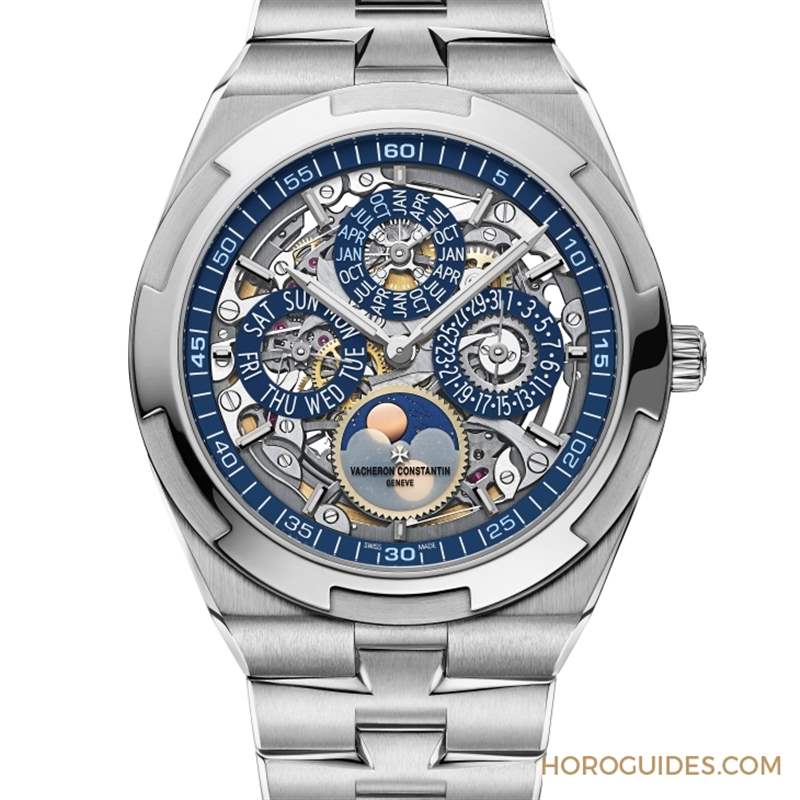 此表款搭載1120 QPSQ/1機(jī)芯,其所具備的功能包含:時(shí)分指示、萬(wàn)年歷(日期、星期、月份、以48個(gè)月為周期的閏年指示)與月相。通過(guò)18K白金鑲貼時(shí)標(biāo)以及日期、星期和月份小表盤(pán),即可一目了然地讀取時(shí)間。一般而言,具有日期、星期和月份顯示功能的腕表,需要根據(jù)每月各異的實(shí)際天數(shù)(28天、29天及30天)進(jìn)行調(diào)校,而江詩(shī)丹頓Overseas鏤雕超薄萬(wàn)年歷腕表在2100年前都無(wú)需任何人工調(diào)校,十分方便。