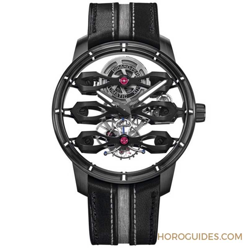 腕表主體正面以及背面的藍寶石水晶玻璃盒可增加表殼內部受光面積,增強指針的易讀性,并創造出機芯仿佛懸浮在兩塊藍寶石水晶玻璃之間的視覺效果。GP標志性的三飛橋設計跨越整個表盤,并采用帶有黑色PVD表面和拋光邊角的鈦合金材料,使整枚腕表的外觀變得十分輕盈,更將原本隱藏的機芯零件展現淋漓盡致。雖然有著悠久的機芯工藝歷史,但GP在這款腕表上采用了懸浮式機芯的創新設計,為了實現這一效果,機芯體積被縮小,主夾板如隱藏一般,形成機芯懸浮在表殼內的「幻覺」。正是這一特點造就了「飛橋」一詞。