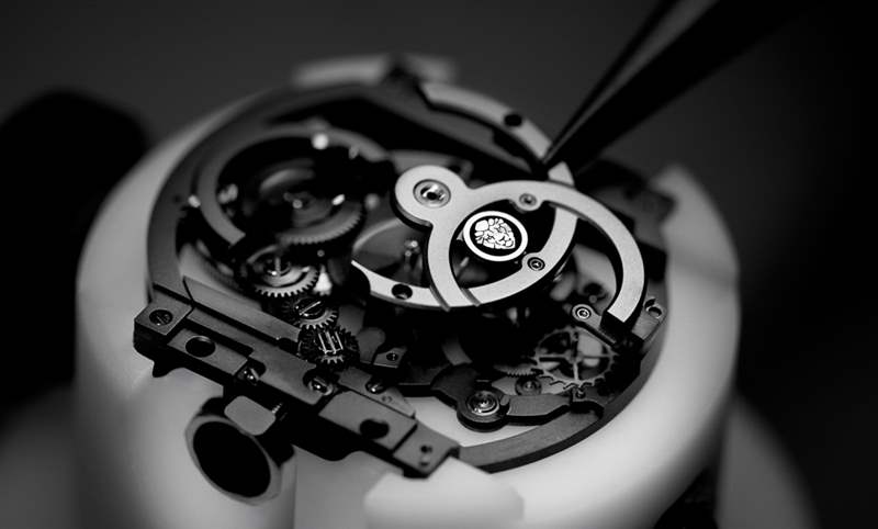 為實現機芯猶如懸浮在表殼中的概念,因此采用完全透明的藍寶石水晶來制作機芯三個主要部件–計時表橋、底板和齒輪表橋。要以堅硬的藍寶石水晶打造出這些厚度不超過1mm的纖薄部件,格外講究精雕細琢,相較于傳統自制機芯組裝工時約三天,Caliber 3.1機芯單是組裝便需歷時一周。