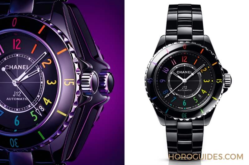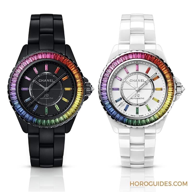 這隊J12彩虹大軍,除了有采用彩色寶石為J12加持的奢華手筆,也有像J12 Electro這樣更能融入日常配戴的設計,在黑色陶瓷版J12的基礎上,以螢光彩虹色時標取代原本位在表盤與單向旋轉表圈上的白色時標。J12 Electro共有兩個版本:表徑38mm款,搭載天文臺認證Caliber 12.1自動上鏈機械機芯,具備時、分、秒與日期顯示功能,日期窗位于4時與5時之間;表徑33mm款,搭載高精準石英機芯,具備時、分、秒顯示功能。