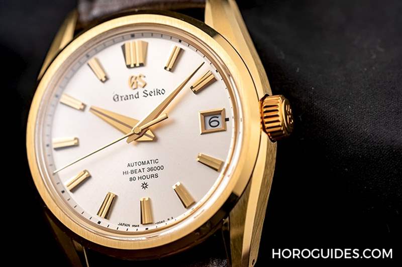 我覺得這一次的面盤更大氣,從12點鐘三瓣式的時標,可以看出它是比較寬的設計,其次品牌的Logo、時標、還有日歷框都是K金的材質,呈現比較尊貴的感覺,再者就是它的時針跟時標,中間有個類似凹槽的線條在表面,可以看出Grand Seiko在制作這樣的表的時候,是非常重視細節的呈現、非常講究的。