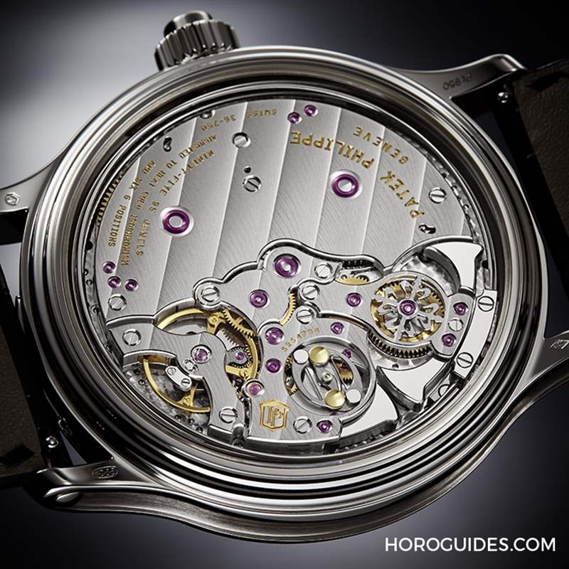 表款搭載GS 36-750 PS IRM手上鏈機芯,703枚零件組成,除大、小自鳴與三問報時功能,并具備跳秒功能(跳秒裝置的星輪和杠桿采用矽材質打造)。振頻為特殊的25,200vph。4個發條盒分別驅動走時與報時輪系,由表冠以不同的轉向上鏈。由于走時與報時輪系采用專利的分離式設計,可有效將低能量耗損,靜音模式下動力儲存可達72小時,如果開啟大自鳴模式則動力儲存為24小時。透過透明底蓋,可以欣賞到報時功能的3組音錘和音簧,以及離心調速器。