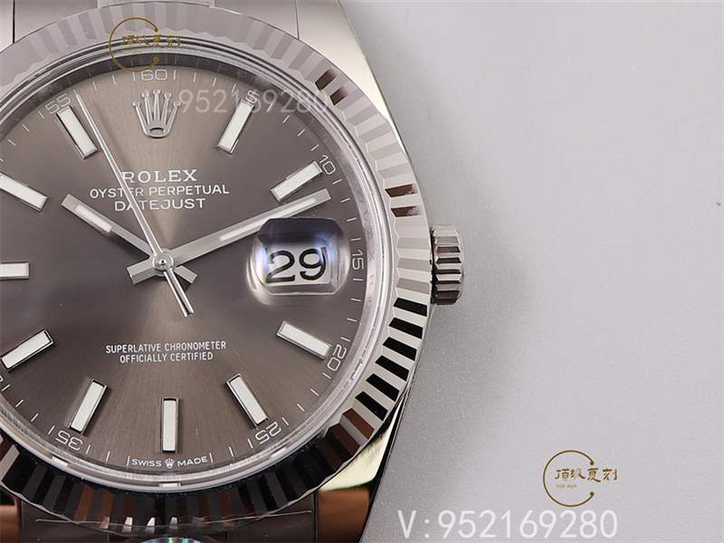 表盤:這款腕表的表盤我們一般稱之為灰色,其實是深銠白色表盤。勞力士表盤采用的太陽光線效果,是在同一金屬上達致純金屬色調的主要方法,譬如是銀灰、銠或釕。鍍銀主要用作太陽光線效果的底層,再在預制表盤上加入其他顏色。有時候,香檳色等色調需以六種以上的金屬進行電鍍。這里來看區別的話相對比較明顯,主要就是盤面放射紋路的密度以及盤面顏色,放射紋路的密度上復刻的我們可以看到密度比之正品要疏松一些所以看起來略有點菱角,這也是盤面看起來略顯得粗糙的唯一方面,顏色上雖然正品為銠白色在鍍金工藝上有區別,不過ar調色很出色,看不錯多大的區分。