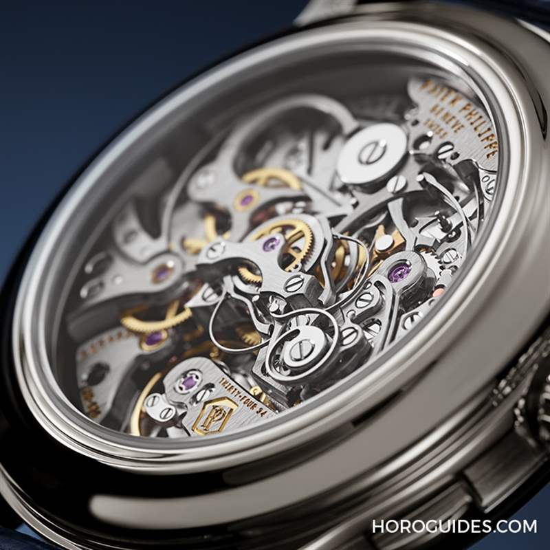 5370P表殼線條也相當豐富,而且更具現代感、設計感,包括凹面的亮面表圈,而表側的凹槽則是拉絲打磨,表耳側還有一個裝飾大圓釘,這些更多變的輪廓,都是讓制作打磨更為費工、但造型更為立體的設計。搭載的CHR 29-535 PS是PP的全自制機芯,細致精巧的追針計時結構絕對是機芯玩家愛不釋手的美麗景致,復雜的零件交錯搭配細膩的打磨修飾,并且擁有PP印記日差-3~+2的精準度。