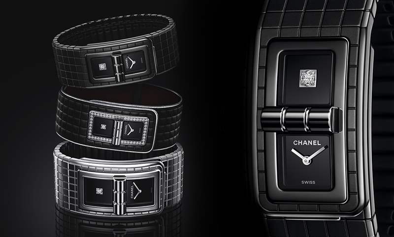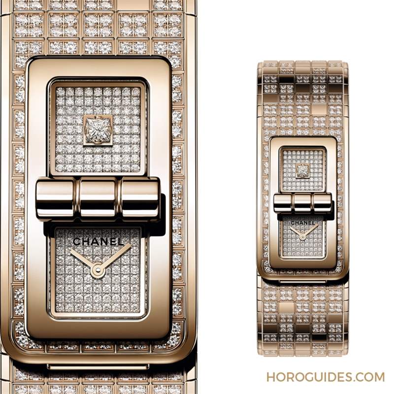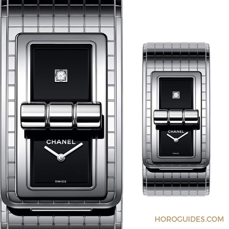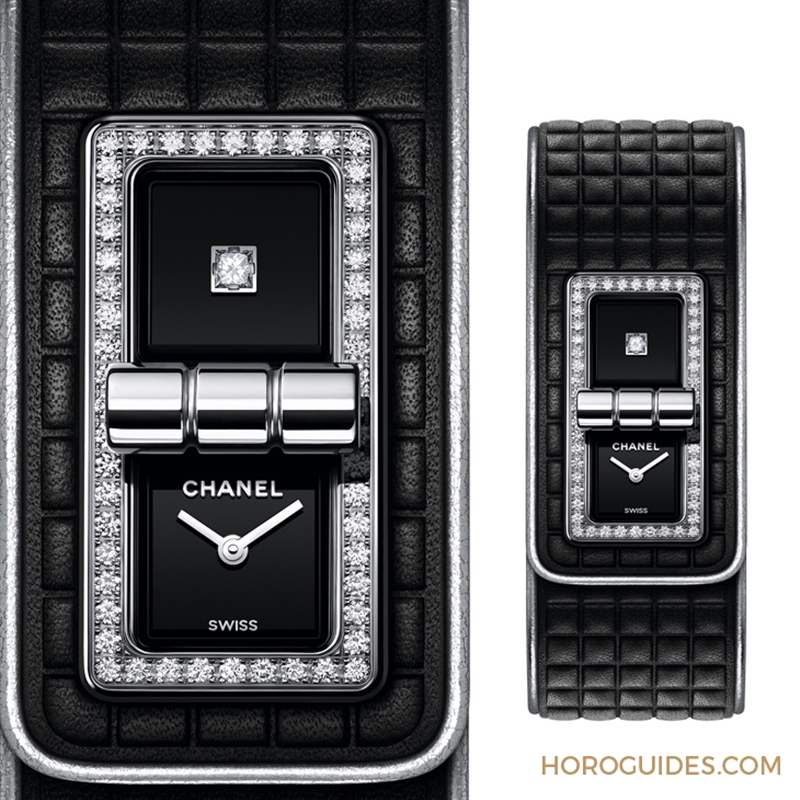 誕生于2017年的Code Coco腕表,形似手鐲,需稍加探索才能破解它的特殊之處-位于表面中心的扣環設計,得自2.55皮包的「Mademoiselle」鎖扣,一扭即可關上;鎖扣開關之間,表盤隨之被隱藏或展現;通體分布的規律格紋,與2.55包款的菱格紋相呼應。整體線條流暢纖薄,按壓藏于六點鐘位置的按扣,即可打開配戴。黑色漆面表盤被中線分為兩個正方形區塊,一邊具備指示時、分功能,一邊則是在中央鑲嵌1顆公主式切割鉆石。