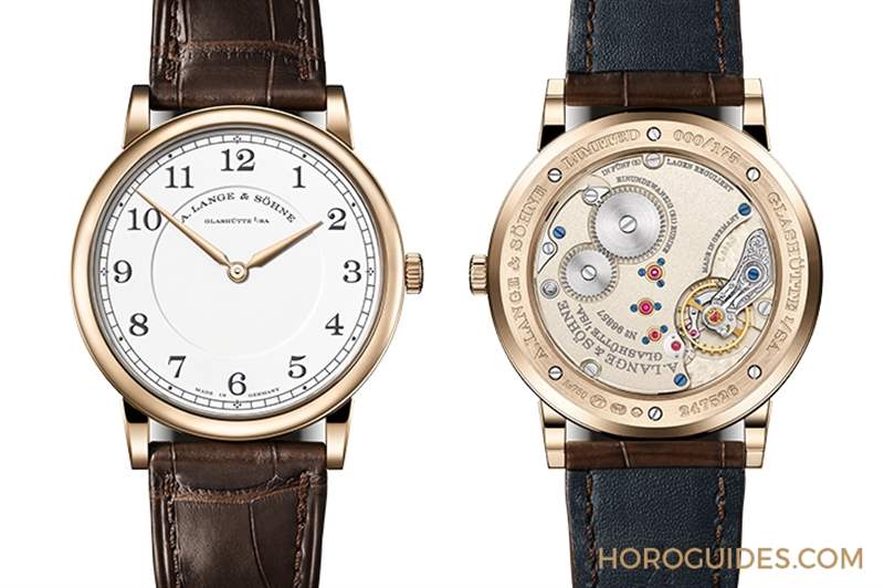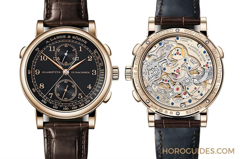 1815 Rattrapante Honeygold追針計時碼表,是朗格Honeygold表殼首次搭配黑色面盤的表款,也是追針款首次搭黑色面盤,少見的黑面組合,再配上金色的字樣與指針,散發迷人氣質。其法語名稱「rattraper」的意思是「重新趕上」,該功能可透過10時位置的按鈕操控。如在計時期間啟動按鈕,中央追針秒針會停止并顯示分段時間,而中央計時秒針則繼續運行。第二次按下按鈕時,會使中央追針秒針跟上,然后與中央計時秒針同步,這個分段計時過程可按需要重復多次。