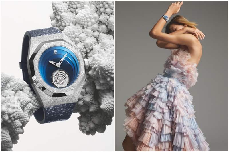 Ralph&Russo也透過全新時裝系列重新詮釋皇家橡樹概念系列飛行陀飛輪腕表,皇家橡樹概念表款的精致女性美學與復雜微機械的交織,進一步突顯服飾特色。