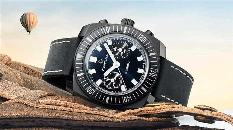 無論是“裸露”精鋼還是黑色PVD涂層,其墊形表殼尺寸為43.5×43.5毫米,可承受200米深的浸入。表圈頂部鑲嵌著一圈藍寶石水晶玻璃。后者的下表面帶有潛水刻度的貼花。黑色漆面表盤飾有一個時圈和兩個涂有白色Super-LumiNova?的“棒狀”指針、中央計時秒針和兩個縱橫交錯的計時盤(9點鐘位置設小秒針,3點鐘位置為分鐘累加器)。該變體具有明亮的橙色上光刻度。